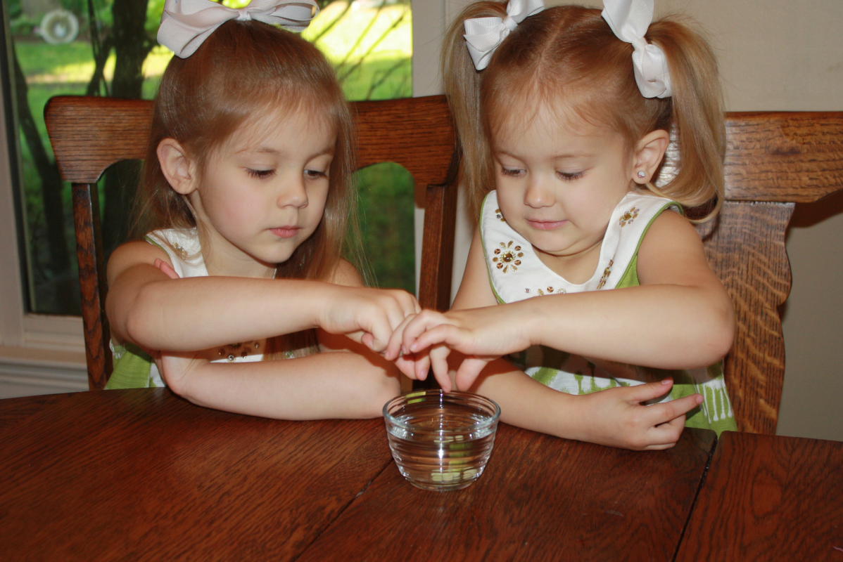 All three kids checking out the results on Day 2. The watermelon seeds had done nothing. The soaked pea seeds looked like that might be in the beginning stages of sprouting but it was a little difficult to tell.